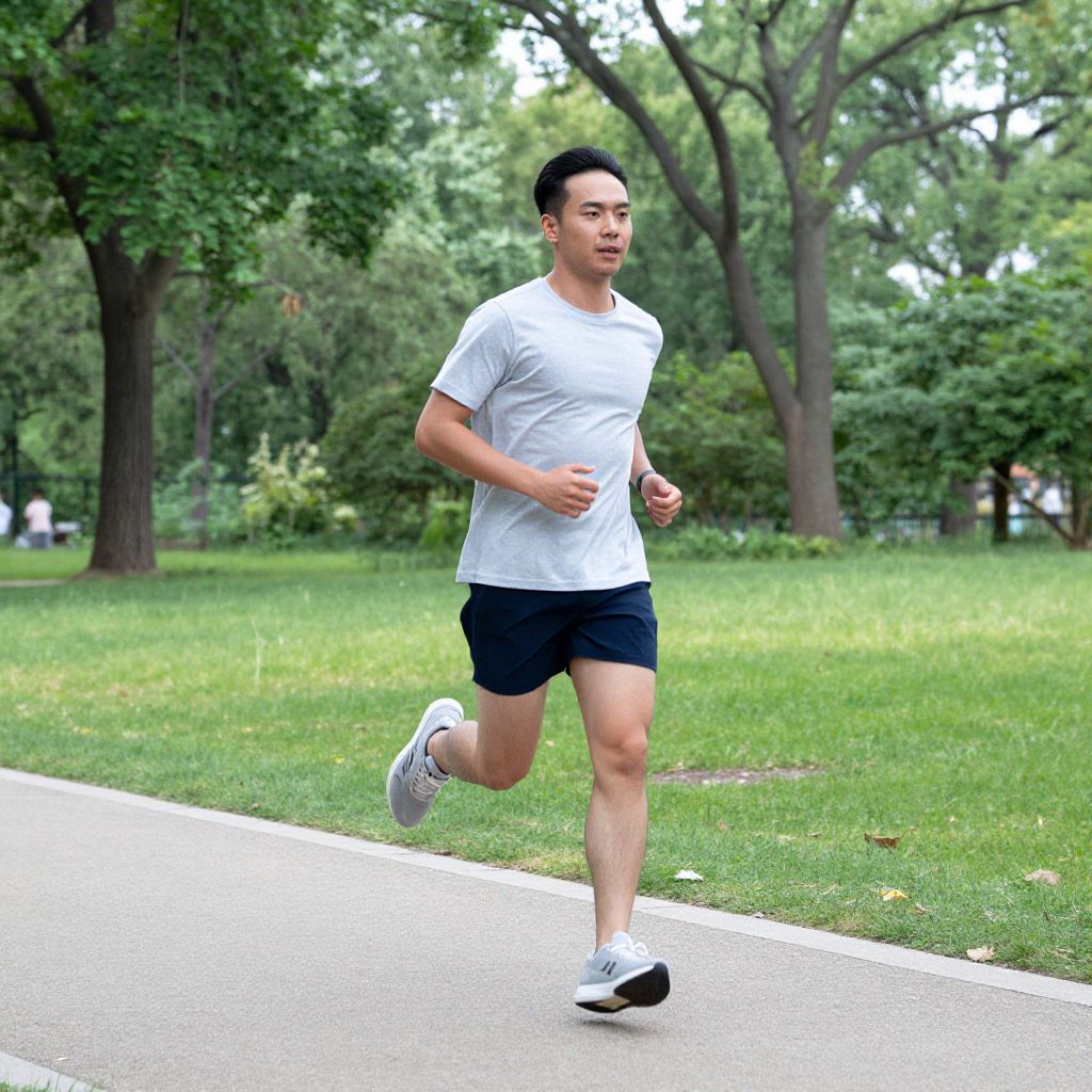 Photograph of an Asian man jogging in a lush green park, wearing a white t-shirt, black shorts, white sneakers, and short black hair.