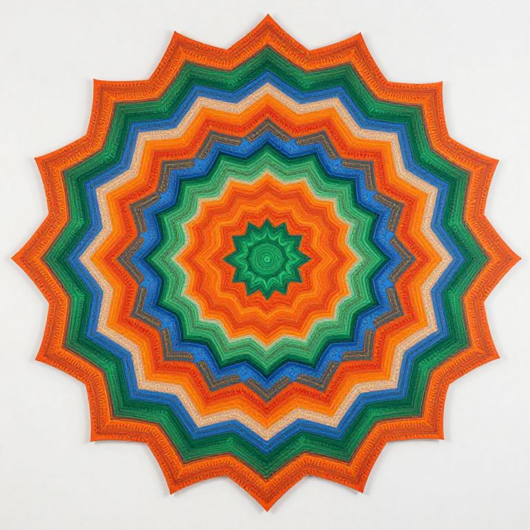 Vibrant geometric patterns radiate outward in a symmetrical design, featuring concentric layers of orange, green, and blue hues, with intricate details and a central green core, showcased as part of Scott Serrano's \"Wallaceana Tri Colored Cereus\" in the \"Great Prentenders\" exhibit at Carrie Haddad in Hudson.