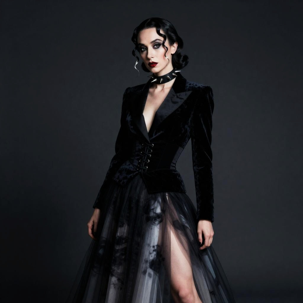 Noir Surrealist Woman in Velvet Tuxedo and Tulle Skirt