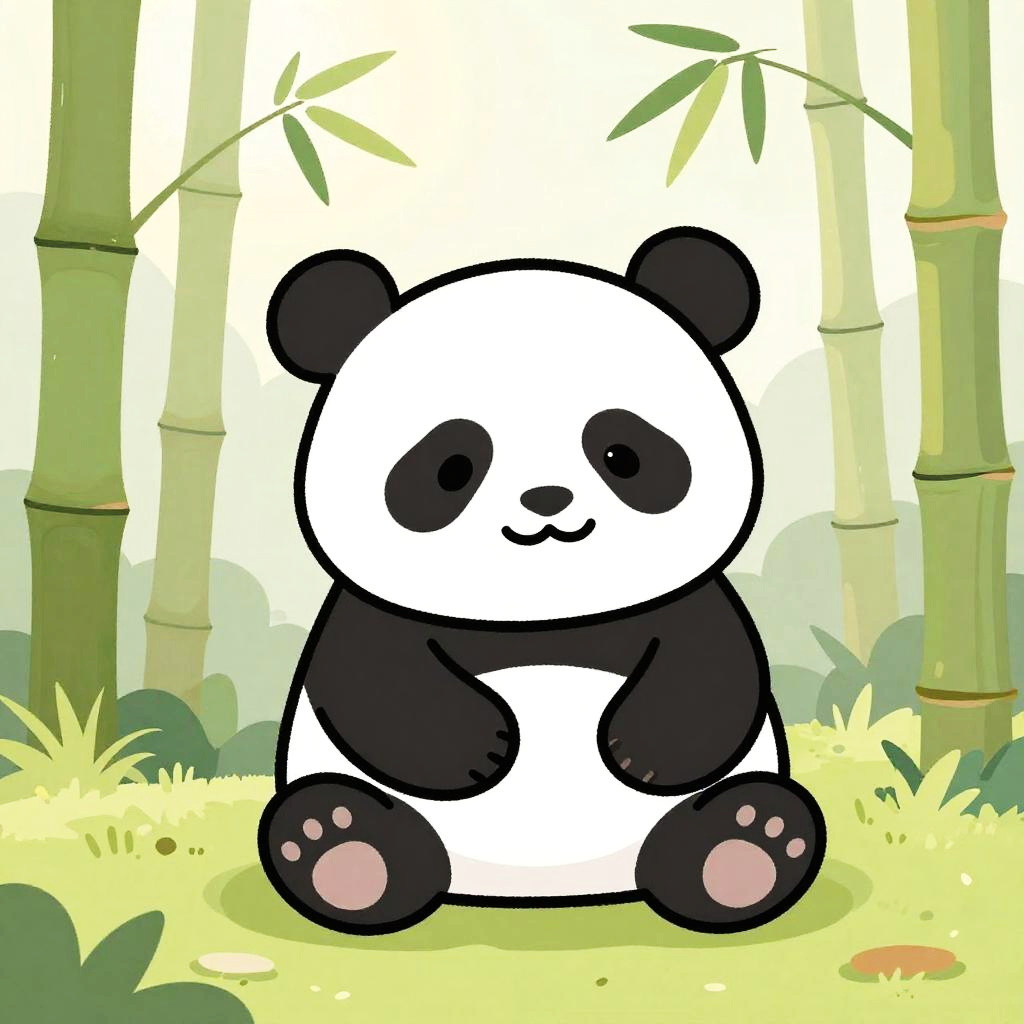 A gentle panda cub with a soft beaming smile sitting by a sunlit bamboo grove clearing. Utilize simple shapes to create a coloring-friendly illustration, emphasizing the calm, cuddly and curious demeanor.