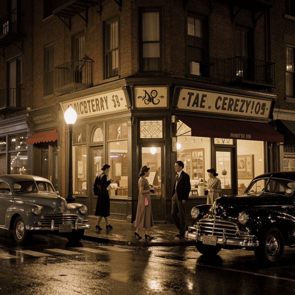 Yesteryear urban street corner illuminated by warm lamplight, classic cars parked, pedestrians in elegant 1940s fashion, vintage storefronts with hand-painted signs, rain-soaked pavement reflecting the lights, moody and cinematic vintage noir ambiance.