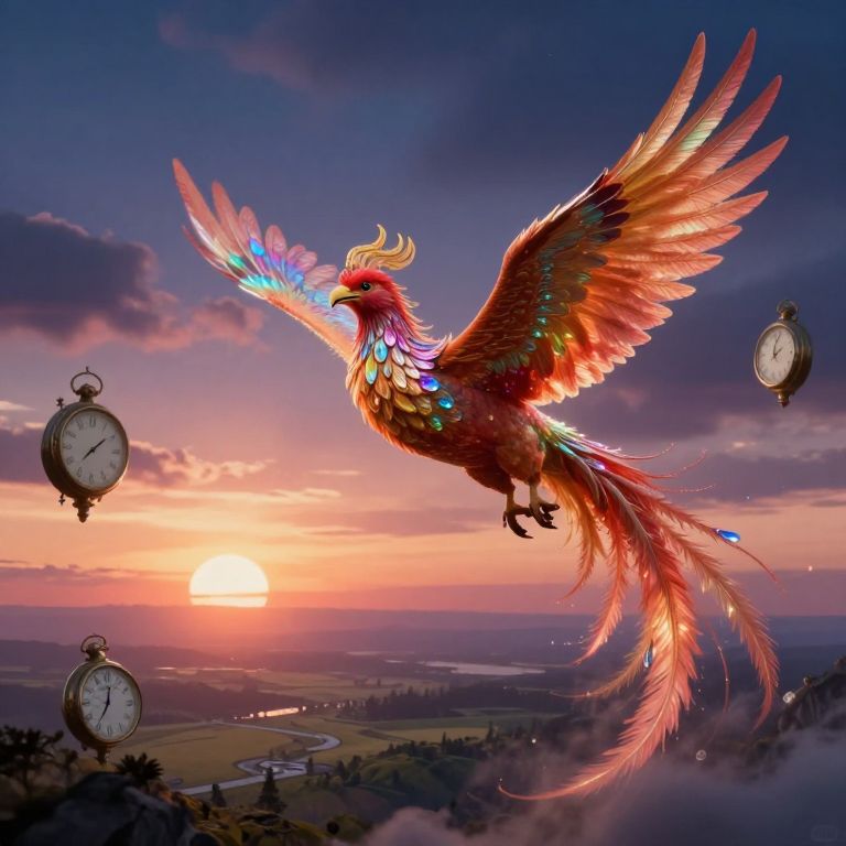 Digital artwork of a vibrant, rainbow-feathered phoenix with glowing accents soaring at sunset, surrounded by floating pocket watches, over a misty valley landscape