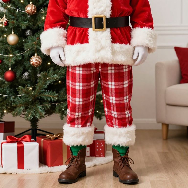 Mannequin wearing a green and red pajama set with a red collar and red accents. He is standing in front of a Christmas tree with presents and a Santa Claus doll.