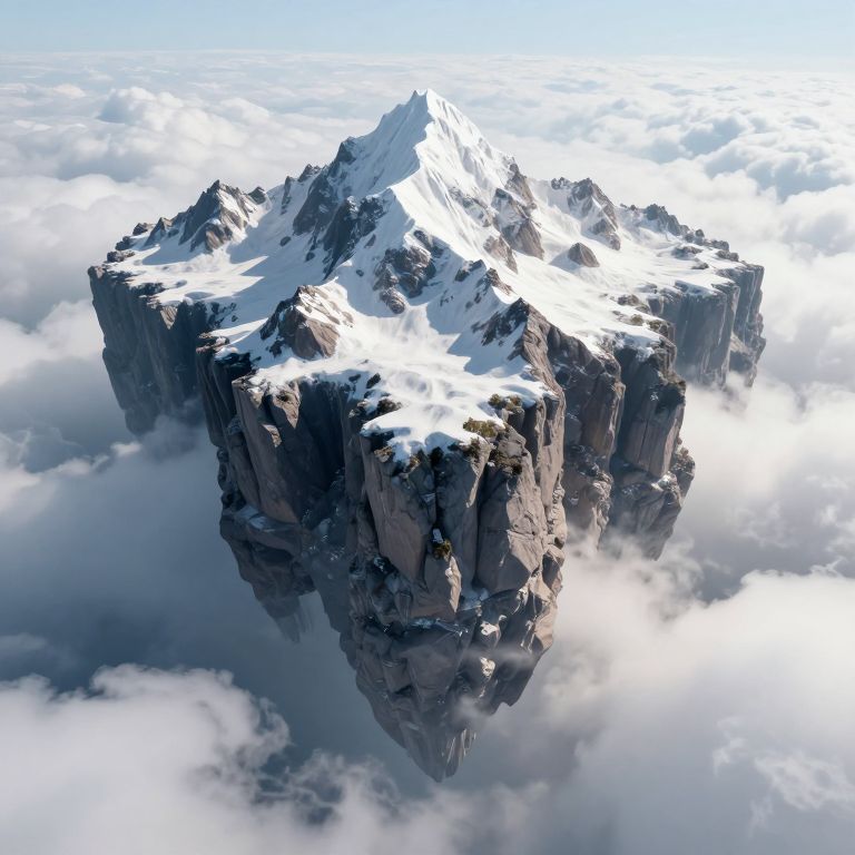 Photorealistic CGI image of a towering, snow-capped mountain peak floating amidst a sea of clouds. The jagged, rocky surface is dark gray with white snow patches, while the surrounding clouds are fluffy and white. The mountain rises sharply from the clouds, with sunlight highlighting the peaks and casting shadows on the lower slopes. The sky above is clear and blue, providing a stark contrast to the white clouds and snowy mountain. The image conveys a sense of isolation and grandeur.