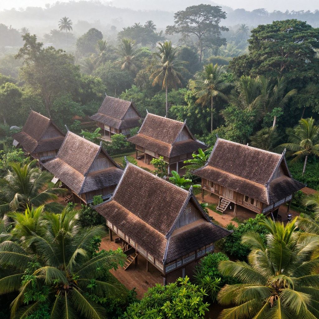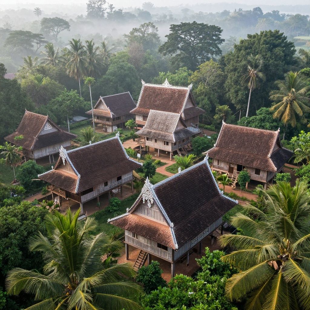 Aerial view of a cluster of khmer houses in dense forest, traditional wooden stilt homes with pitched roofs, misty morning ambiance, detailed roof carvings, surrounding palm trees and greenery