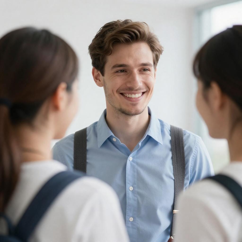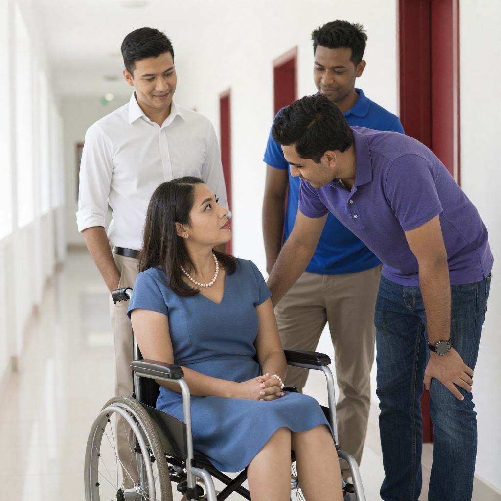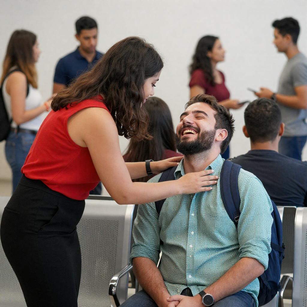 Photograph of a crowded indoor waiting area. Woman in red sleeveless top and black skirt leans over bearded man in green checkered shirt, who is laughing with eyes closed. Blue backpack on man's back. Other people in background, some standing, some seated, engaged in conversation. Bright indoor lighting.