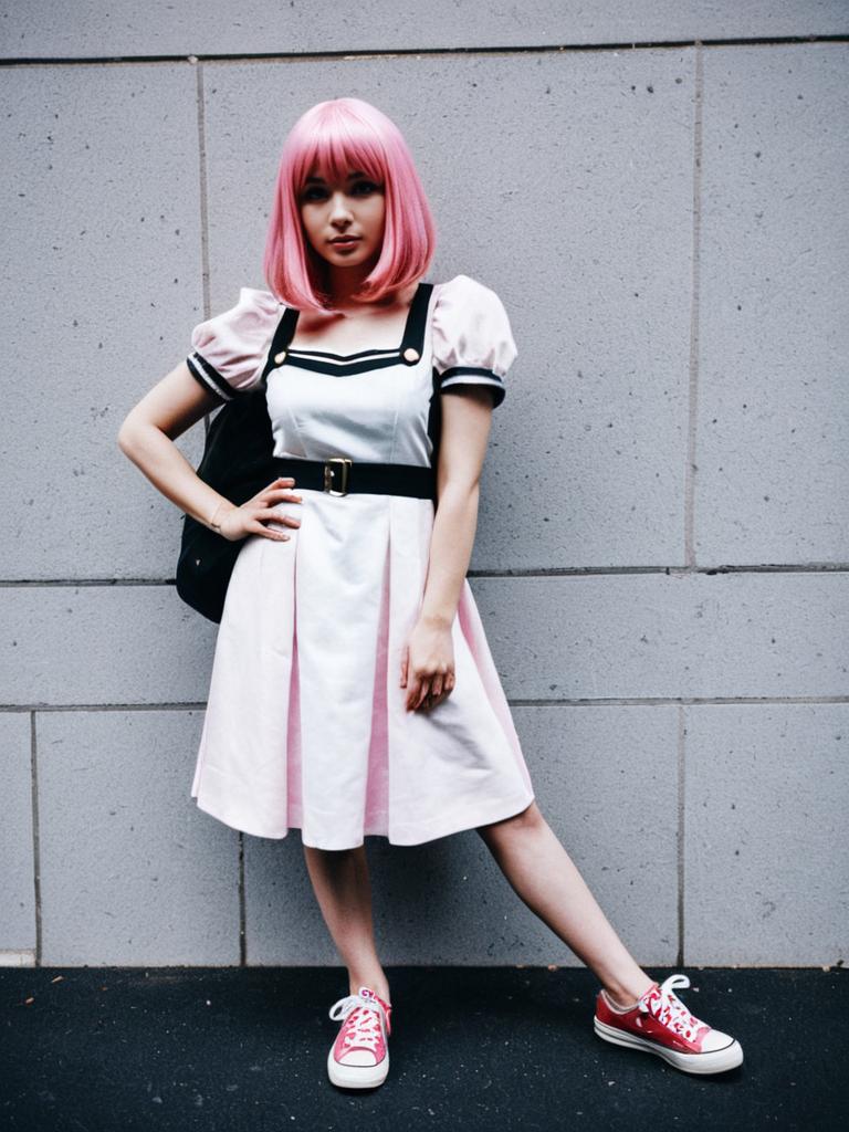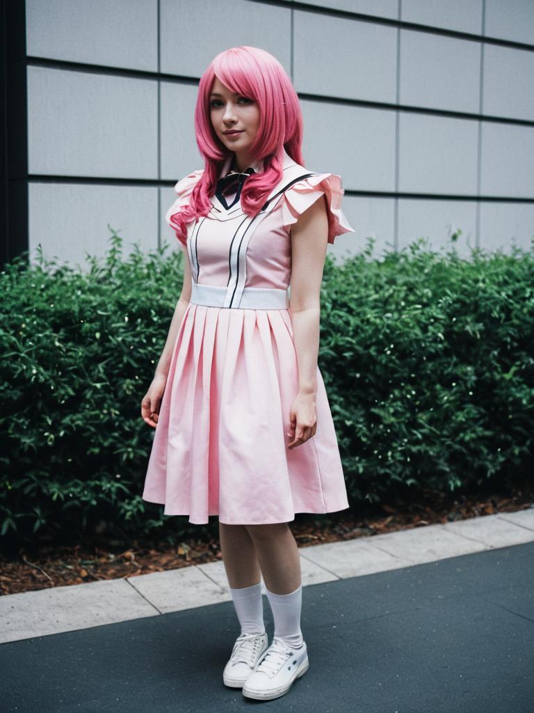 Man in Anya Cosplay, full-body cosplay photo with pink wig and dress