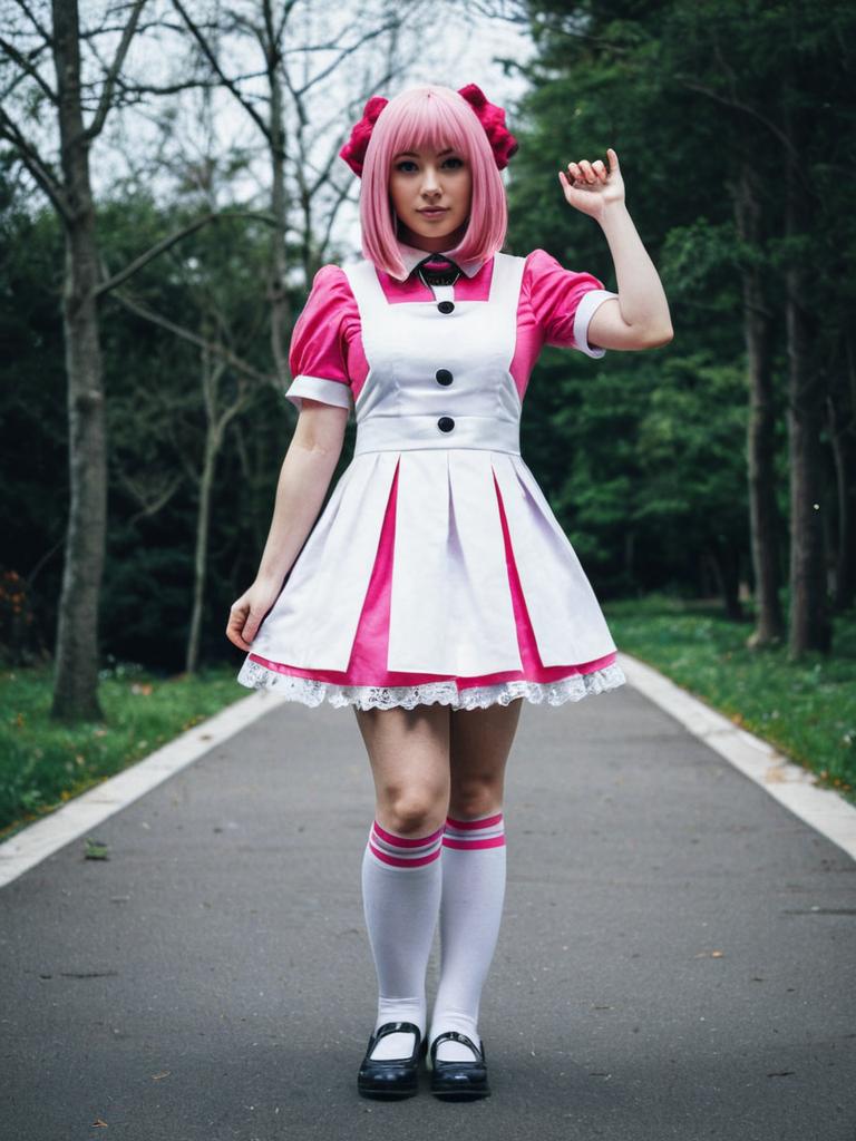 Full-body portrait of a young woman with pale skin wearing a pink wig and a bright pink and white dress styled as Anya cosplay, posing outdoors against a natural forest background with green foliage and trees.