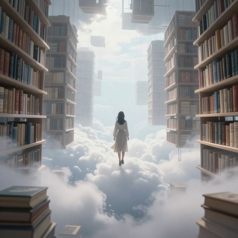 In a surreal realm where knowledge ascends like whispers of the wind, a solitary figure climbs toward the ethereal library suspended in the heavens, seeking solace in the boundless expanse of dreams and forgotten truths.