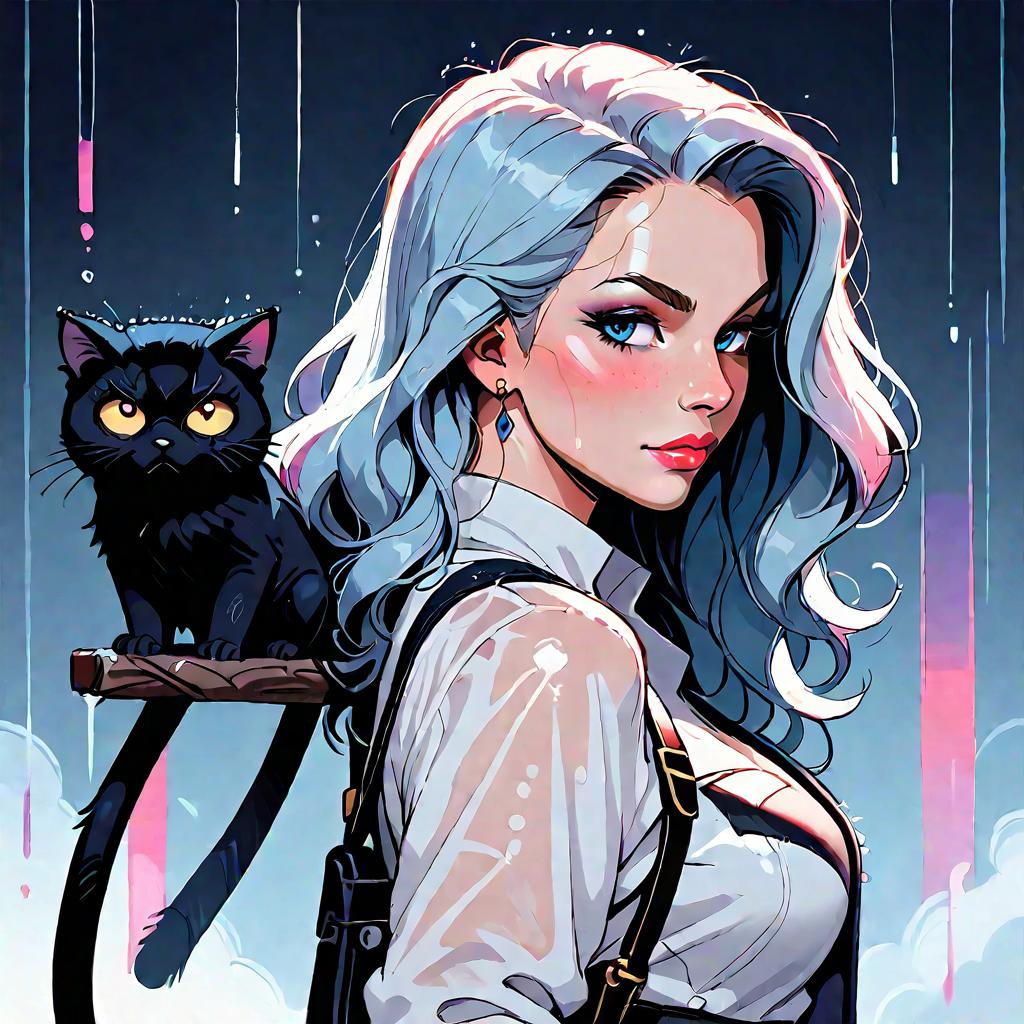 Score_9, score_8_up, score_7_up, score_6_up, score_5_up, score_4_up, black cat \(marvel\) standing looking at viewer, from behind, raining, night time