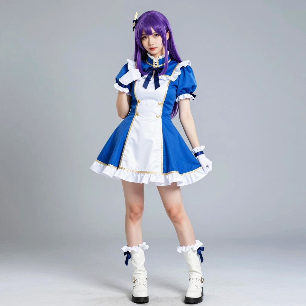 A woman poses confidently in a realistic cosplay outfit inspired by the character Shantae. She wears a vibrant purple costume with a distinctive large hat, long purple hair, and red bead necklace, showcasing a blend of fantasy and playful style.