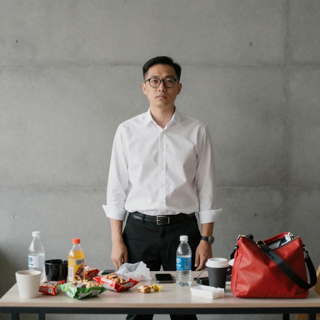 Photograph of a man with glasses, wearing a white shirt and black pants, standing behind a cluttered table. The table holds various items including snacks, drinks, a red bag, and personal items. The background is a plain gray concrete wall. The man stands centrally, looking forward, with a neutral expression.
