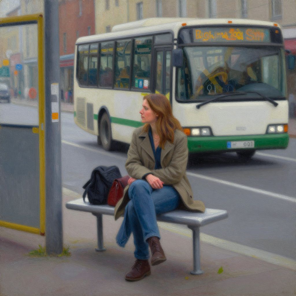 Photograph of a young woman with brown hair, wearing a green coat and blue jeans, sitting on a bus stop bench, watching a white and green