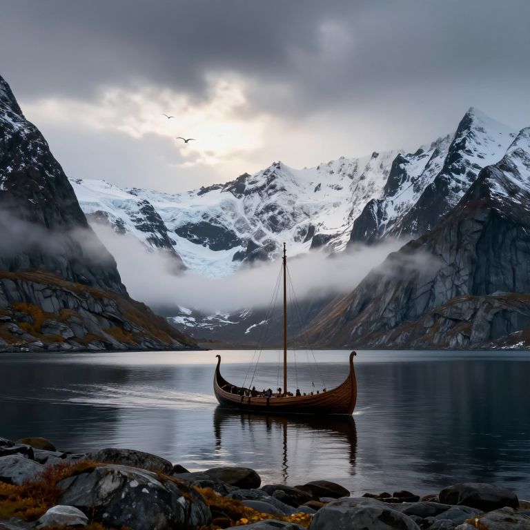 Photograph of a Viking-style longship sailing on a serene, reflective fjord, surrounded by snow-capped mountains and misty valleys under a cloudy