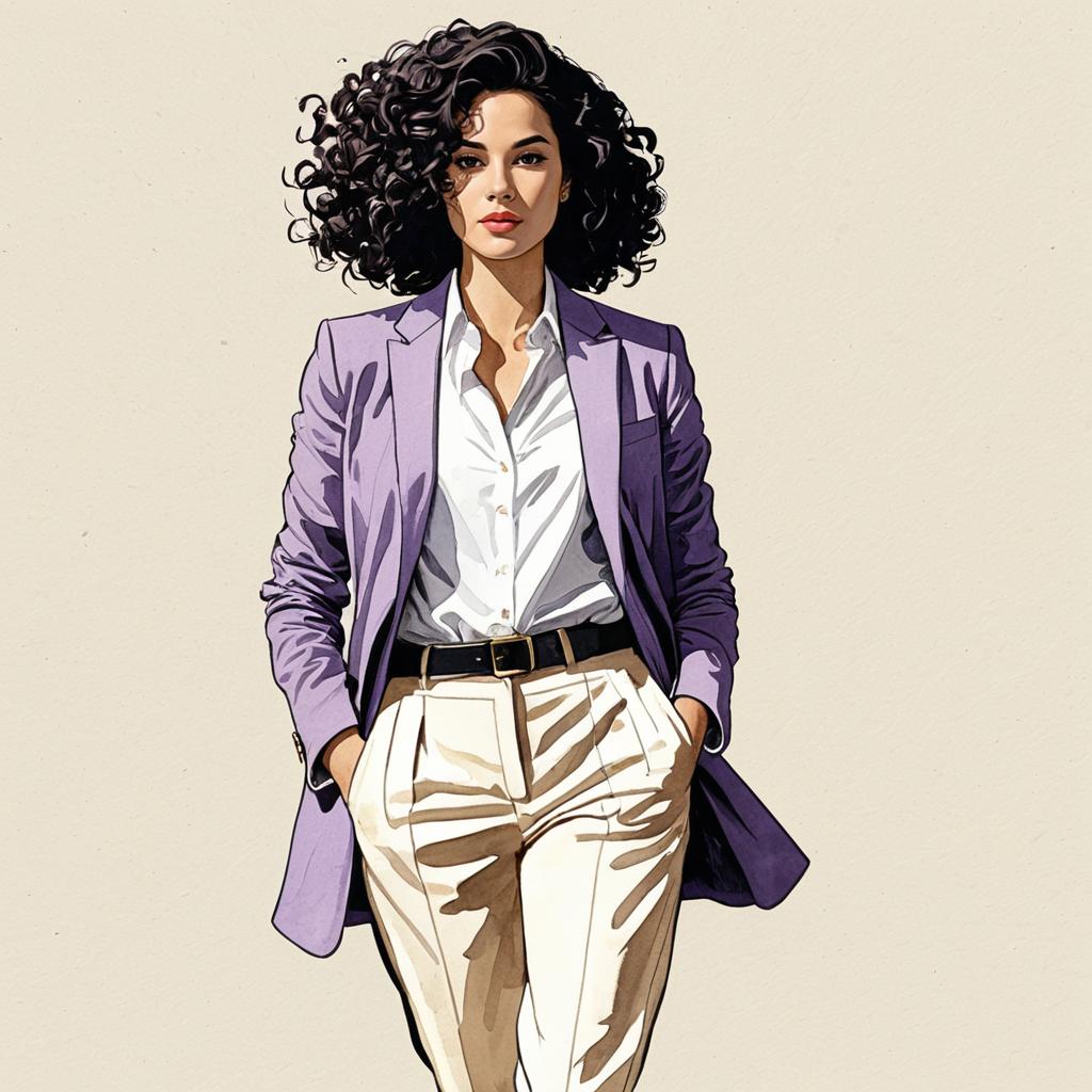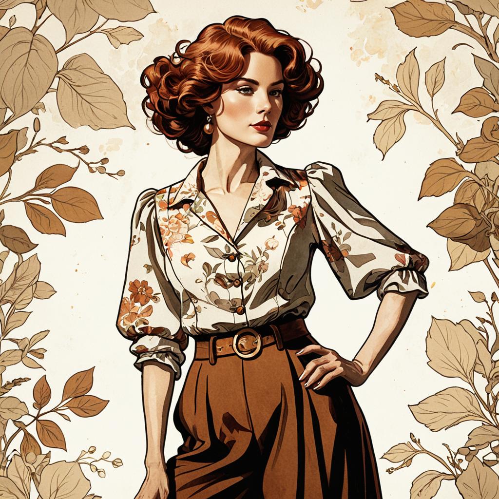 An exquisite 8k ultra-high-definition graphic novel-style illustration featuring a young woman in her teens dressed in elegant pastel pink blouse paired with a high-waisted skirt, soft flowing curls with hairpins. The illustration combines digital and watercolor techniques, showcasing a harmonious blend of beige, brown, gold, and white tones. Extraordinary lighting enhances the ultra-realistic and distinctive artistic style reminiscent of Billelis, Kiri Østergaard Leonard, fashion, photo, portrait photography, illustration