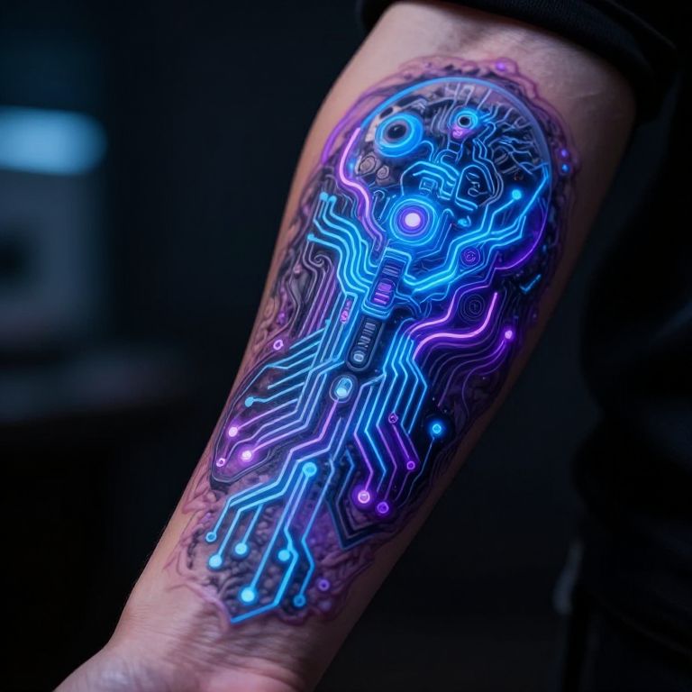 Photograph of a forearm tattoo featuring a glowing, neon blue and purple circuit board design. The intricate pattern of lines and nodes resembles a futuristic, electronic circuit, with bright blue and purple hues contrasting against the skin. The tattoo is set against a dark background, making the neon colors pop. The skin around the tattoo is slightly textured, with the forearm slightly angled to the left. The overall style is cyberpunk-inspired, with a high-tech, digital aesthetic. The lighting emphasizes the glowing effect of the tattoo.