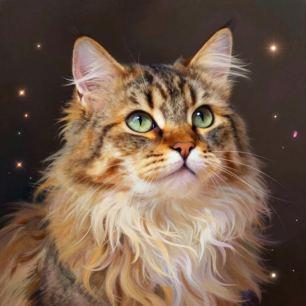 Furry cat art, a detailed close-up of a majestic long-haired cat with intricate fur texture, vibrant colors, digital painting style, fantasy background with sparkling lights and floating petals, ethereal and magical vibe