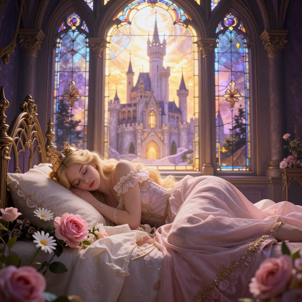 Princess in pink gown with gold crown sleeps on ornate bed, surrounded by roses, in front of stained glass window showing a castle at sunset.