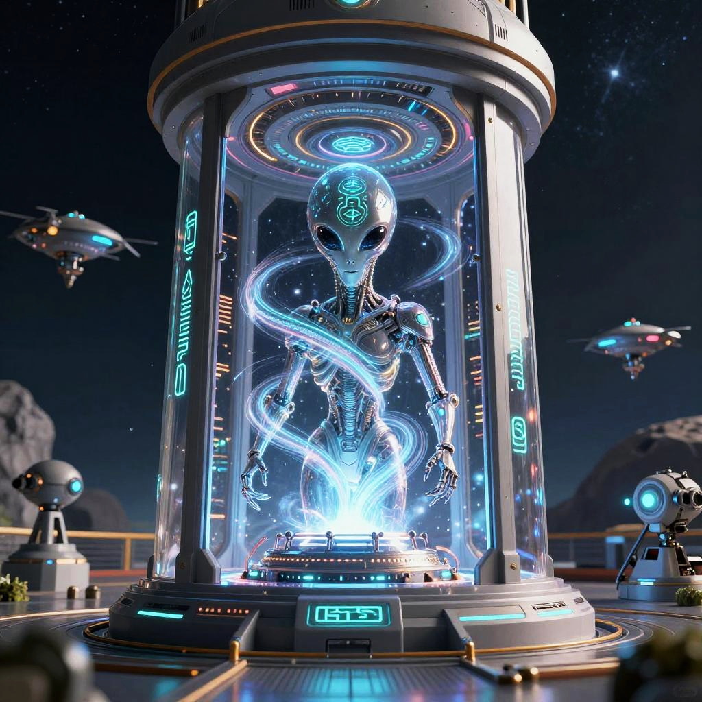 Alien generator machine emitting swirling energy waves, housed within a crystalline chamber on a distant planet, illuminated by glowing alien runes and surrounded by floating robotic drones, intricate and futuristic design.