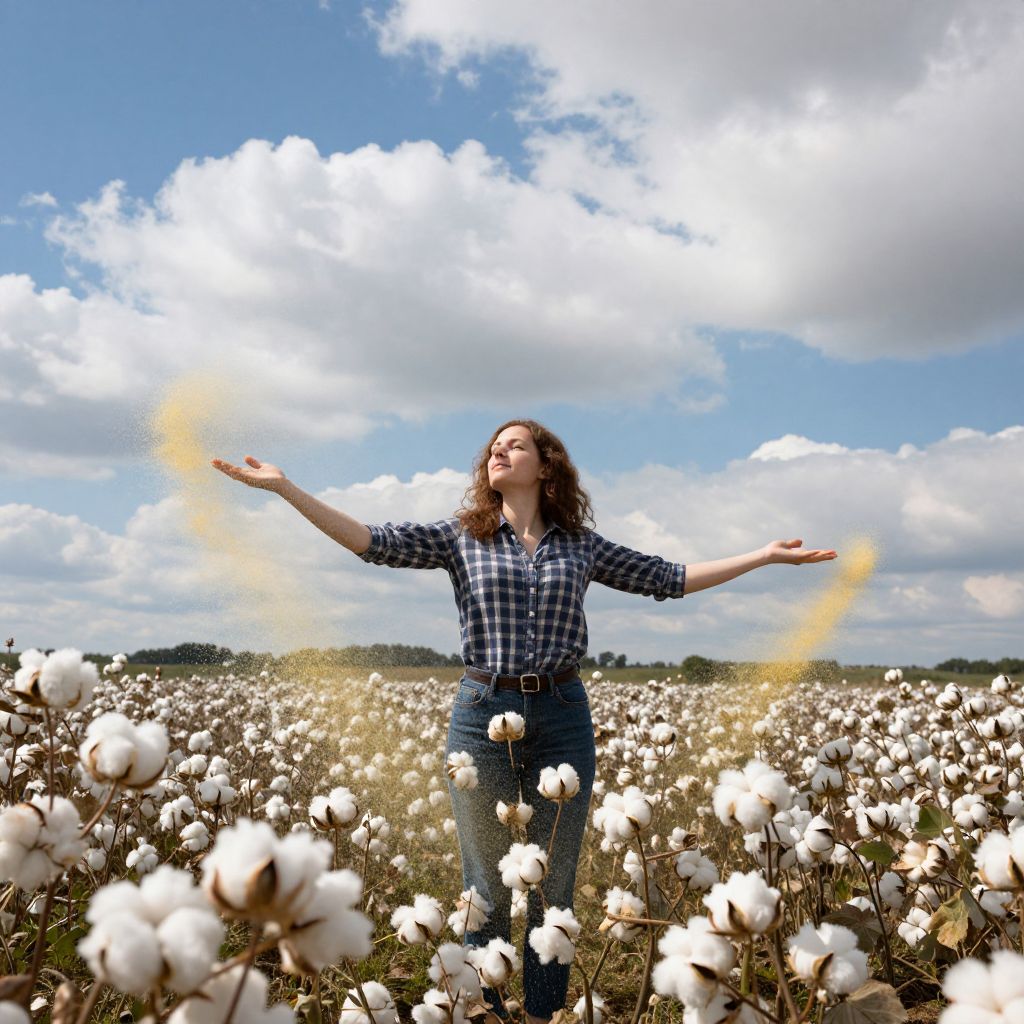 A young woman stands amidst a field of fluffy white cotton plants, her arms outstretched as she releases a cascade of golden pollen into the air, creating a shimmering trail against a backdrop of vibrant blue sky and soft, billowing clouds.