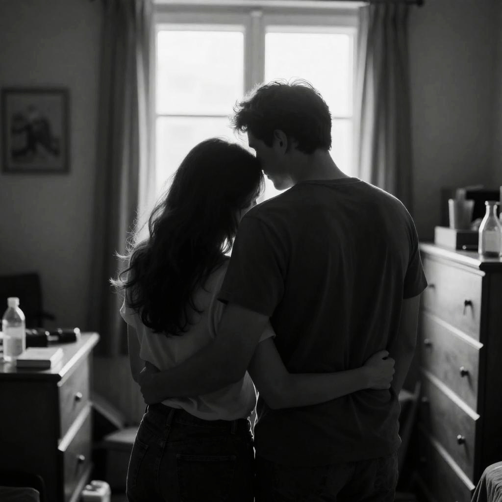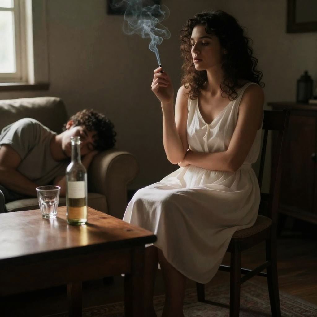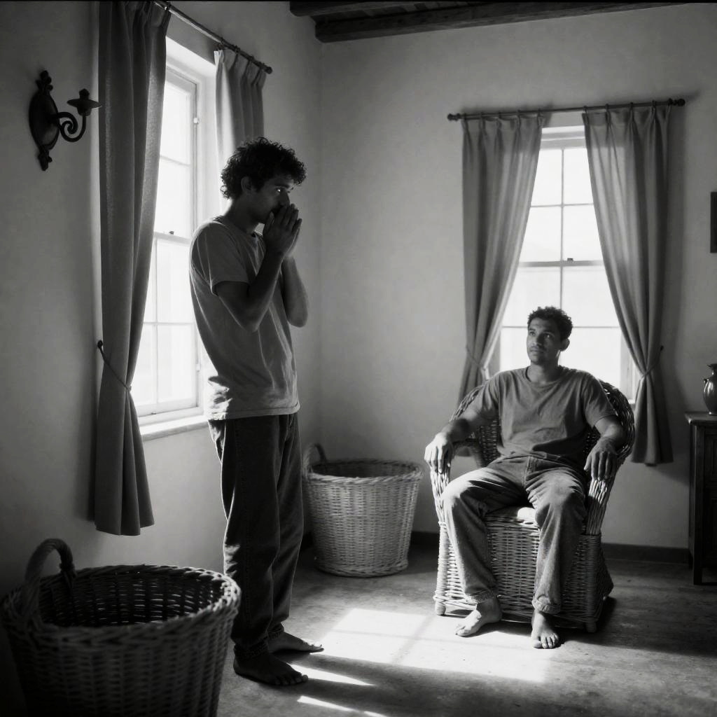 Black-and-white photograph. Two men in a sunlit, wicker-furnished room. Man in foreground, hands to mouth, standing by window. Man in background, sitting in wicker chair, looking forward. Wicker baskets on floor, window curtains, ornate wall sconce. Sunlight streams through window.