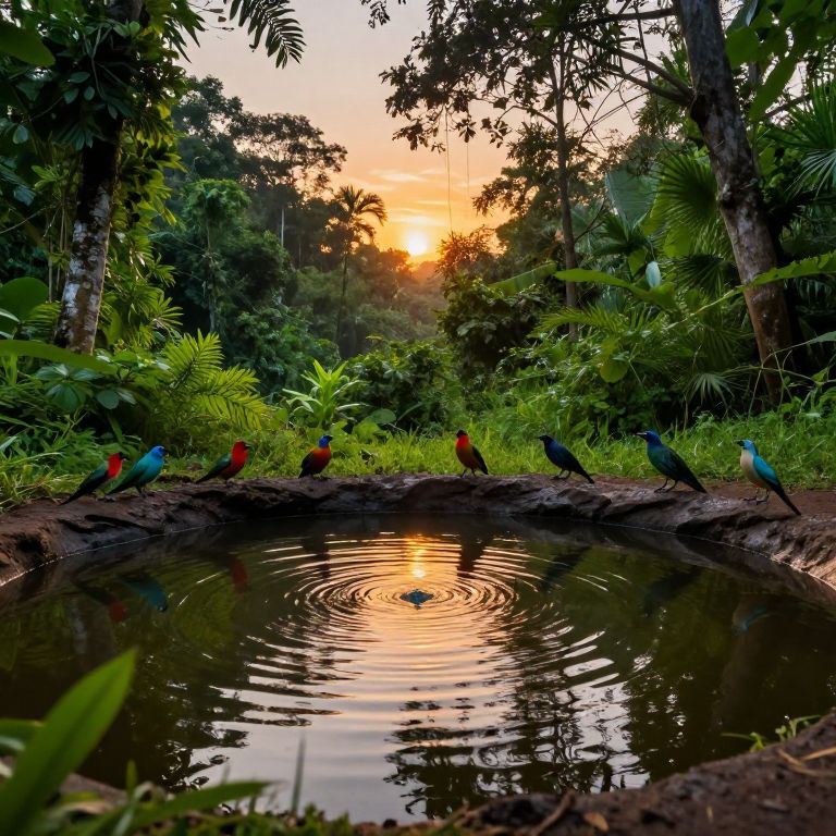Waterhole at sunset surrounded by lush jungle greenery, colorful birds perched nearby, gentle reflections on the water surface, vibrant palette, detailed textures, serene atmosphere, hyper-realistic style.
