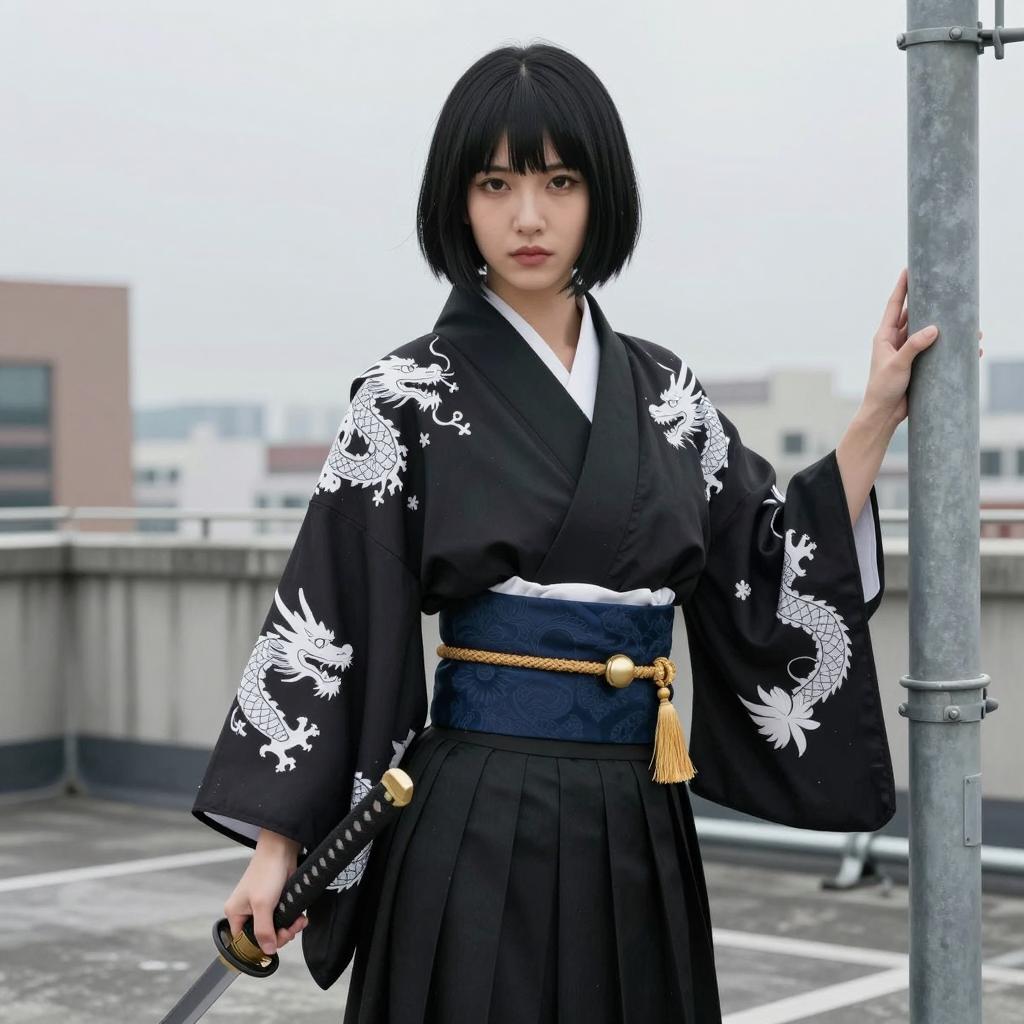 Asian woman with long black hair, wearing a black sailor uniform with red neckerchief, holding two katanas, standing in front of a shoji screen with masks in the background. Red fabric on the floor. Serious expression. Her right arm raised, left arm down. Textured wooden background. Japanese setting. Photo.