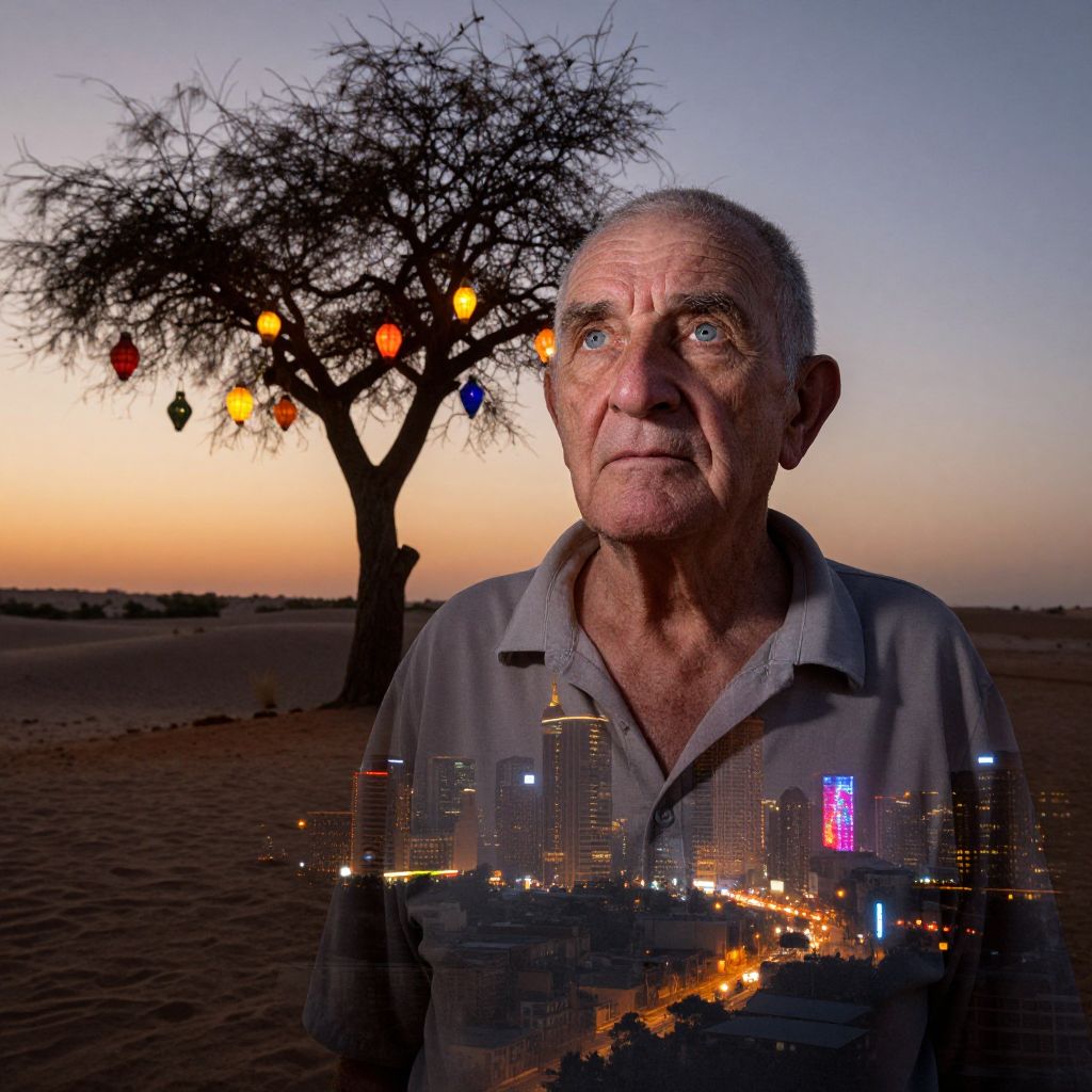 Photograph of elderly man with wrinkled face, gray hair, wearing open shirt, standing in desert at sunset. Tree with colorful lights behind, city