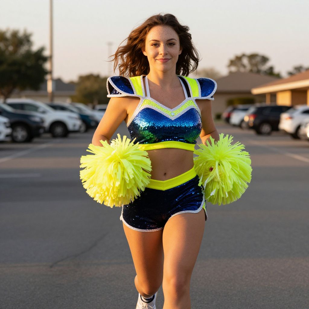 A cute, energetic woman in a modern cheerleader outfit with sequins, neon pom poms, and sporty shoulder pads, jogging through a brightly lit parking lot at dusk, wearing athletic sneakers, smiling with a confident smirk, freckled face, warm sun-kissed complexion, golden hour lighting, realistic portrait photography. The woman has big tits and cute face