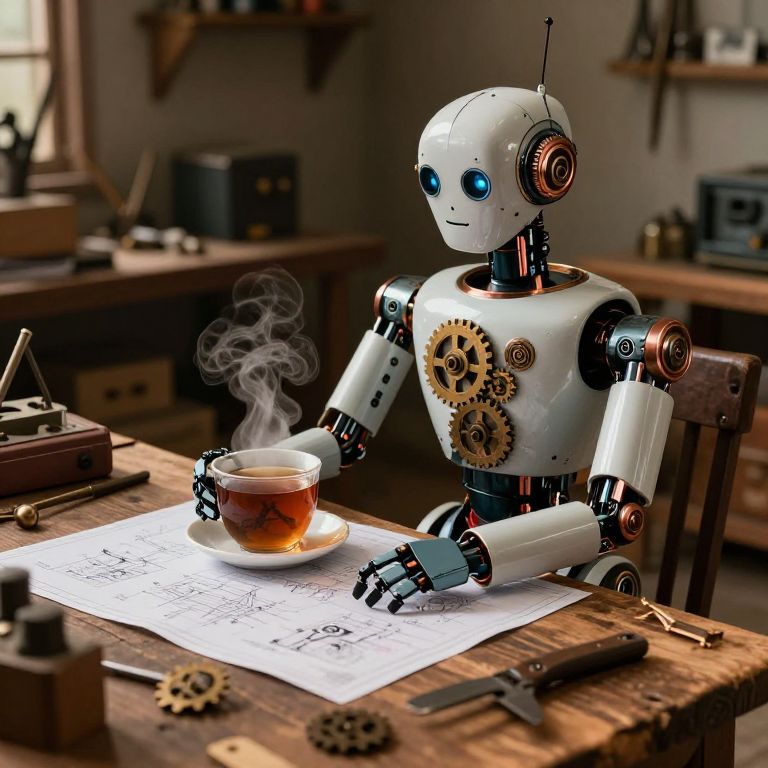 Robot sitting at a rustic wooden table in a cozy, dimly lit workshop filled with tools and blueprints, steam rising from a cup of tea, vintage steampunk aesthetics highlighting gears and copper accents, warm and inviting atmosphere