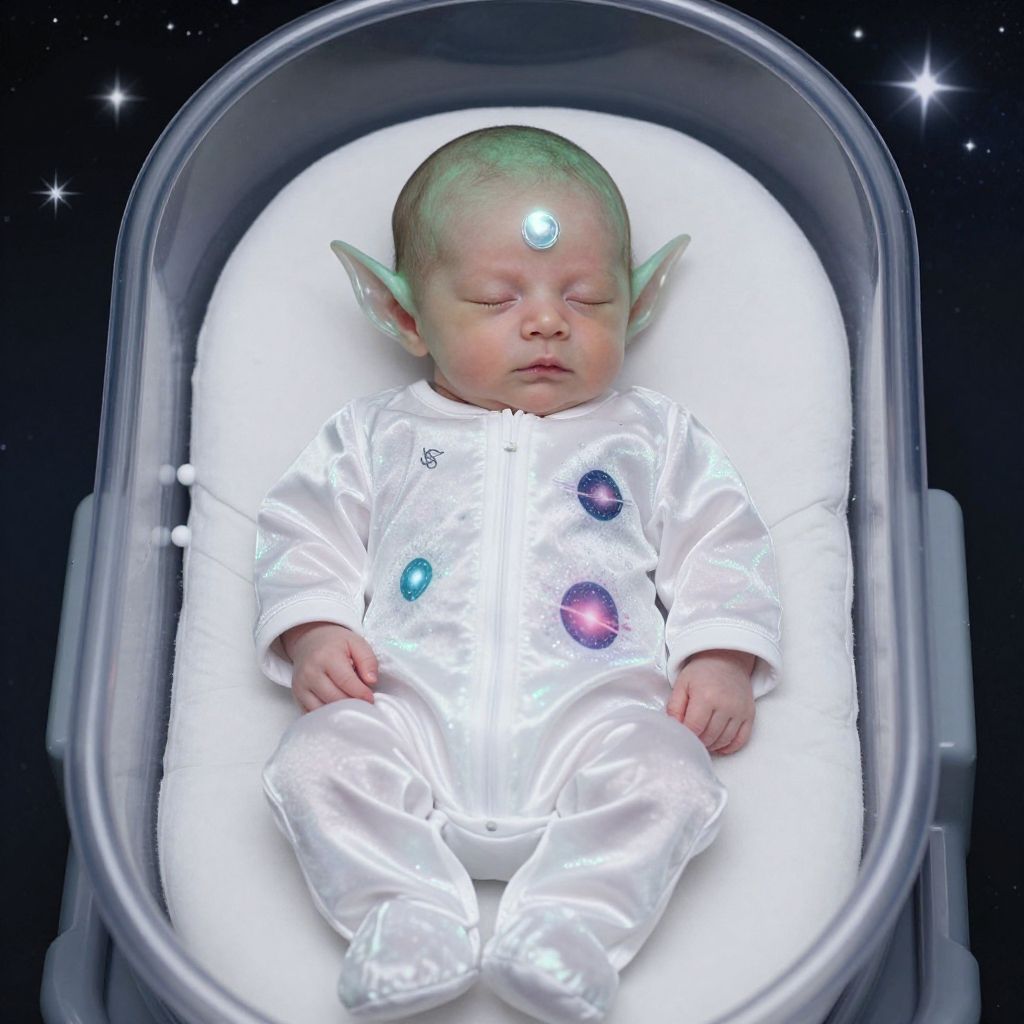 Newborn alien costume illustrating a tiny alien infant with smooth greenish-gray skin, elegant translucent fins for ears, and a glowing forehead gem, dressed in a shimmering white jumpsuit with cosmic patterns, lying peacefully in a high-tech cradle surrounded by stars.