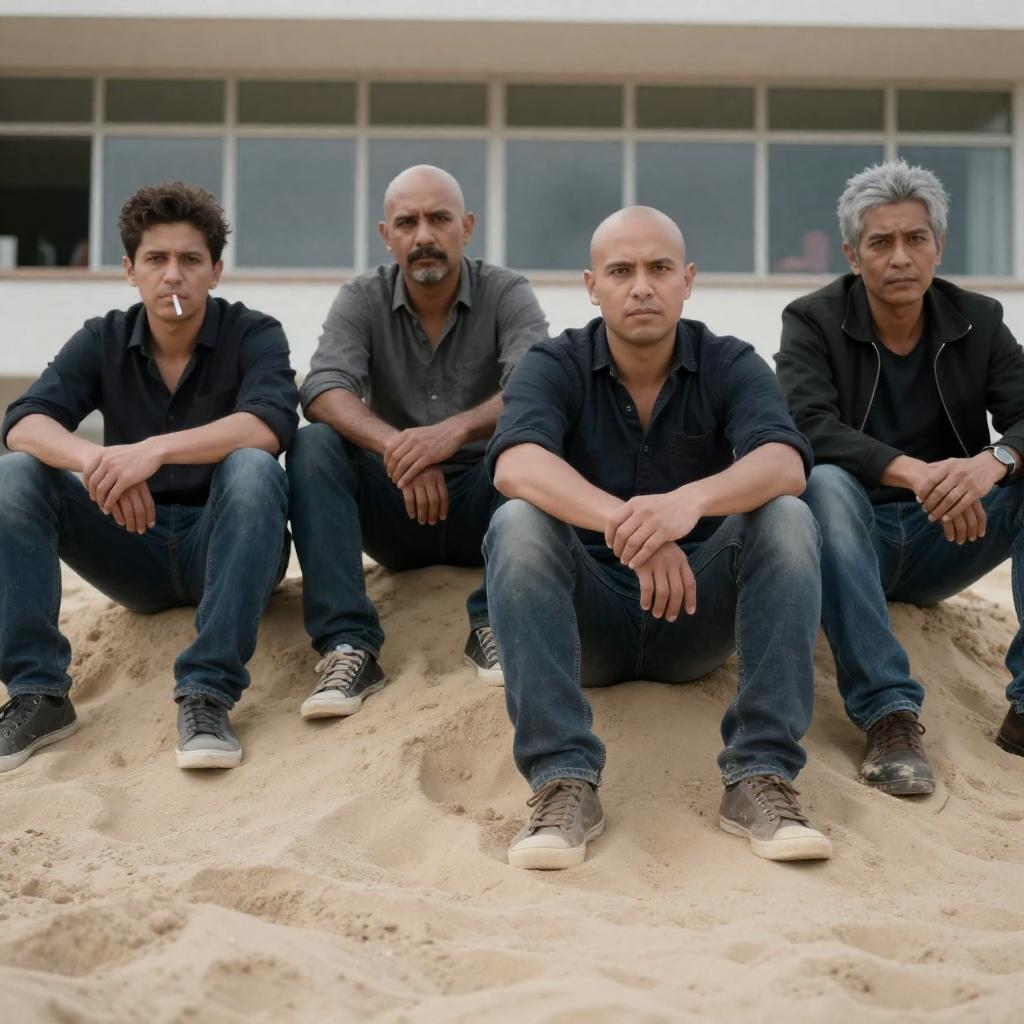 Group of four casually dressed men sitting outdoors on a pile of sandy material. The men wear dark jackets and blue jeans, with one man smoking a cigarette. They have neutral or serious expressions and the background shows a building with white-framed windows.