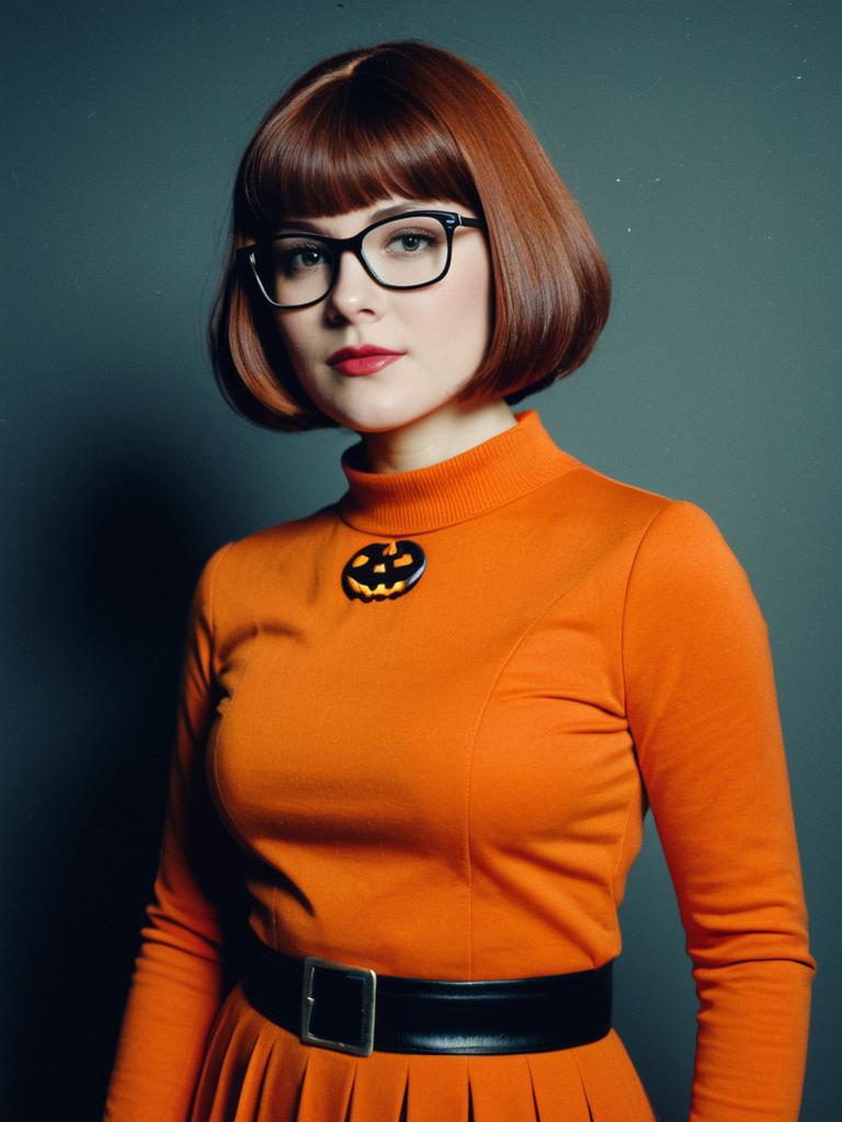 Woman in Velma Halloween Costume, detailed photorealistic studio portrait