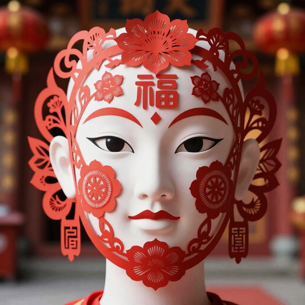 Chinese face filter, artistic rendition of a face decorated with delicate red paper cutting patterns, symmetrical floral and cultural symbols, soft ambient lighting, background hinting at a festive temple celebration, detailed high-resolution digital art, harmonious blend of tradition and technology.
