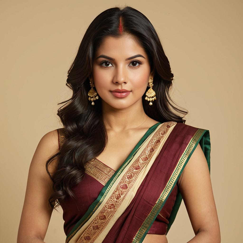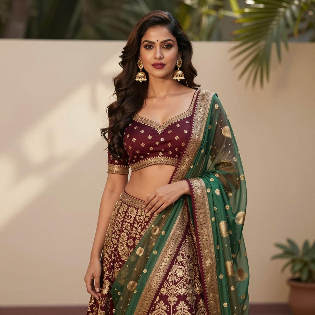 Bollywood style lehenga, photograph of a beautiful Indian woman, long wavy dark brown hair, wearing a traditional saree with intricate gold and green patterns, maroon cropped top with gold embroidery, large gold chandelier earrings, dark red lipstick, standing in front of a beige wall with green foliage in the background, sunlight casting soft shadows, confident expression, traditional Indian attire, detailed saree fabric, medium skin tone, glamorous and elegant, portrait orientation