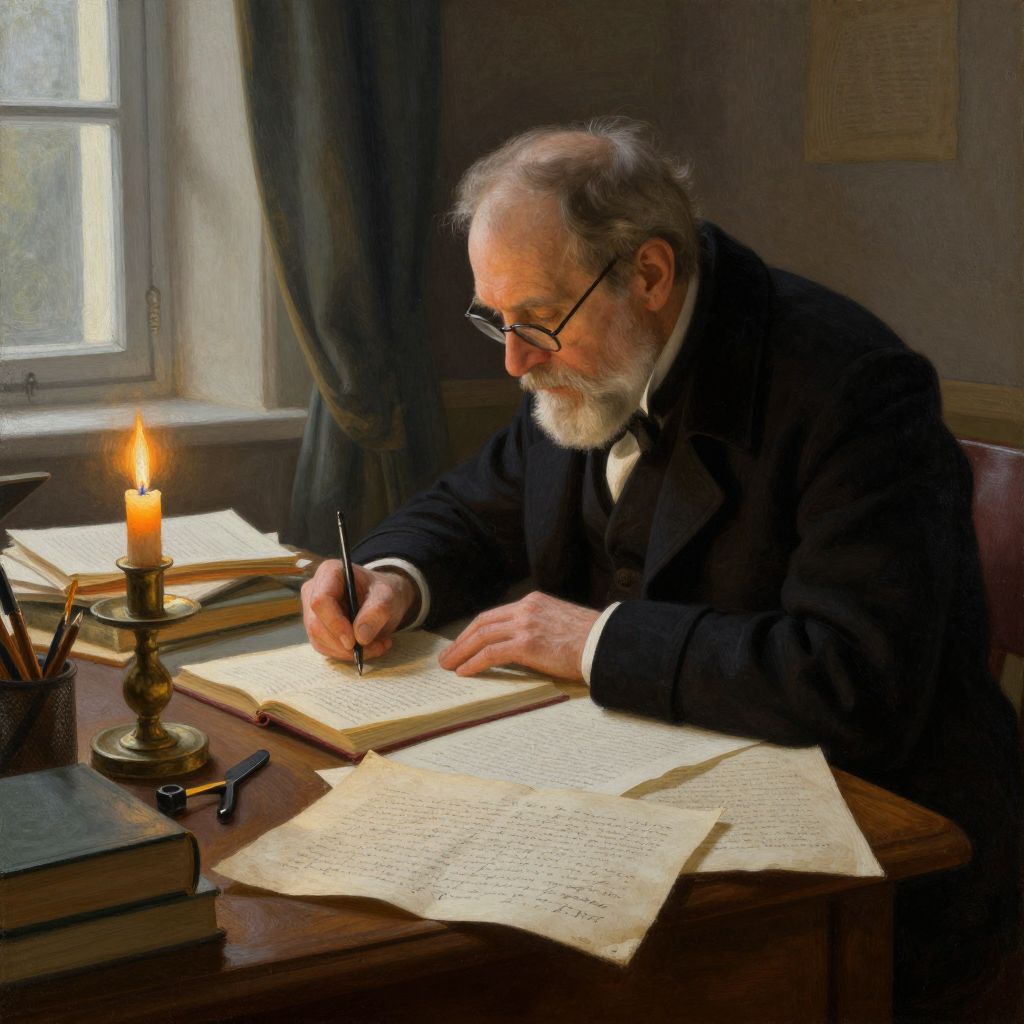 In this detailed painting, an elderly man with a white beard and glasses is engrossed in writing at his desk. The man, dressed in a dark coat and a white shirt, is seated at a wooden table cluttered with books, papers, and writing implements. A lit candle on a stand illuminates the scene, casting a warm glow on the papers and the man's face. The desk is strewn with open books and sheets of paper, some of which are filled with handwritten text. The background features a window with a curtain, allowing natural light to filter in, enhancing the cozy, scholarly atmosphere. The overall composition is rich in texture, from the rough paper and the fine lines of the writing to the soft folds of the man's coat and the intricate details of the candle and its stand. The scene captures a moment of intense concentration and intellectual pursuit, with the man deeply immersed in his work.