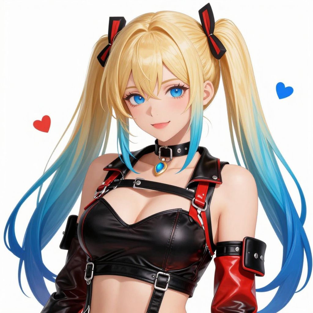 This is a digital anime-style illustration of a blonde woman with long twin-tails that transition from blonde to blue at the ends. She has bright blue eyes and wears black, leather harness-style clothing with red accents and straps. Her outfit includes a black, strapless bra-like top, red sleeves with black cuffs, and a black choker with a blue gem. She has two small red and black bows in her hair. The background is white with small red and blue hearts on either side of her head. The overall style is vibrant and detailed, with a focus on her colorful hair and striking outfit.