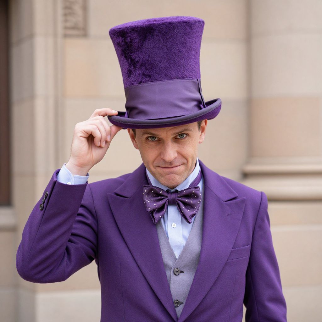 Purple Mad Hatter Top Hat, man in a purple suit and top hat posing for a picture
