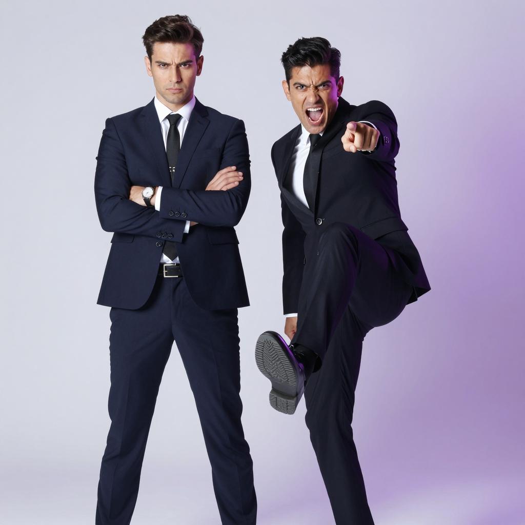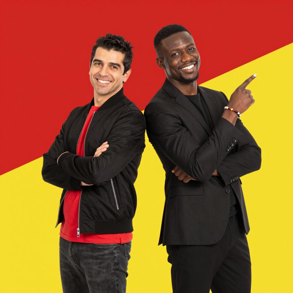Photograph of two men against a divided red and yellow background. The man on the left has black hair, wears a black jacket with red shirt, smiling with arms crossed. The man on the right is black, wears a black suit, smiling, pointing with right hand, wearing a bracelet. Both men have medium builds.