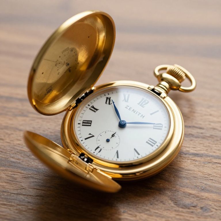 Golden Zenith pocket watch with alarm mechanism displayed open, showcasing its classic design and intricate details against a wooden surface.