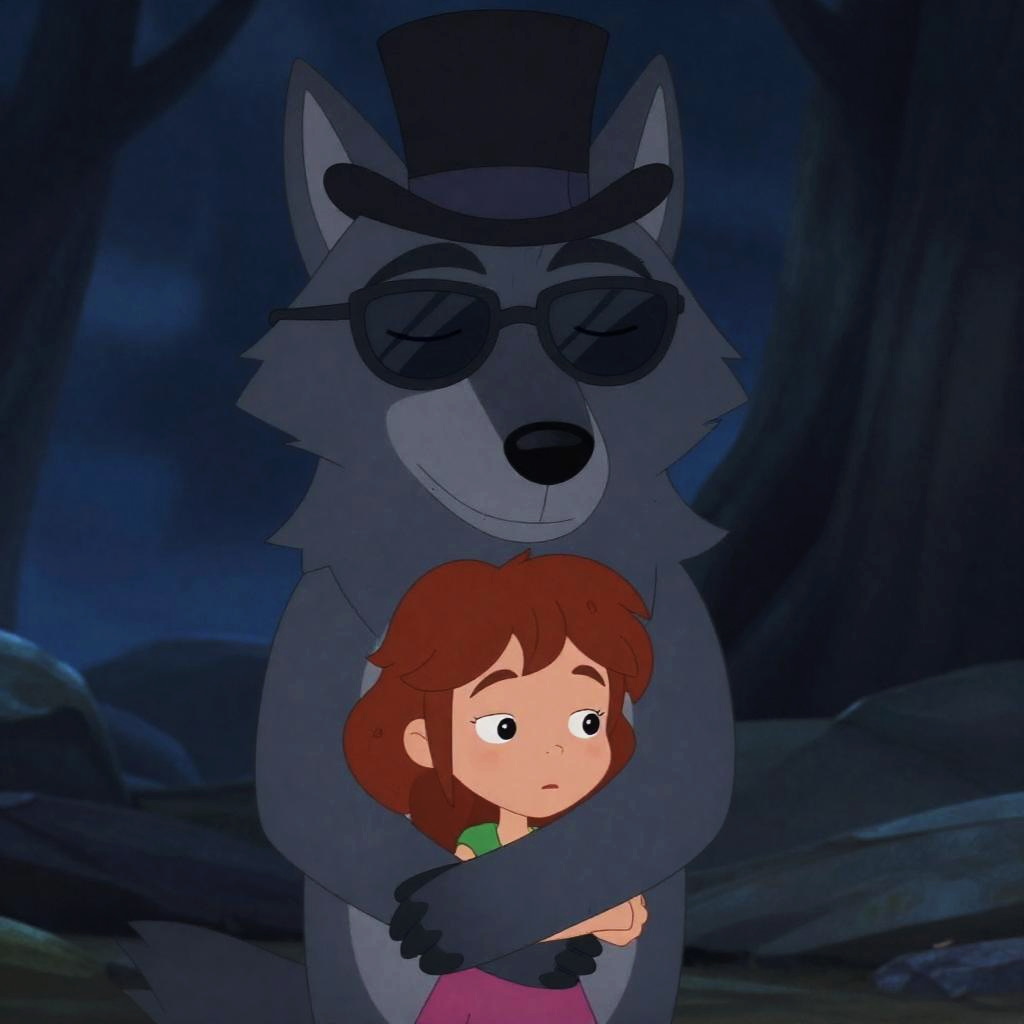 Digital illustration of a night scene. A large, dark gray, wolf-like creature with spiky fur and a mohawk stands on a wooden ledge. A small, white, pink-maned creature with a worried expression peeks from below. Background features a gothic-style castle with lit windows and starry sky. Trees surround the castle.