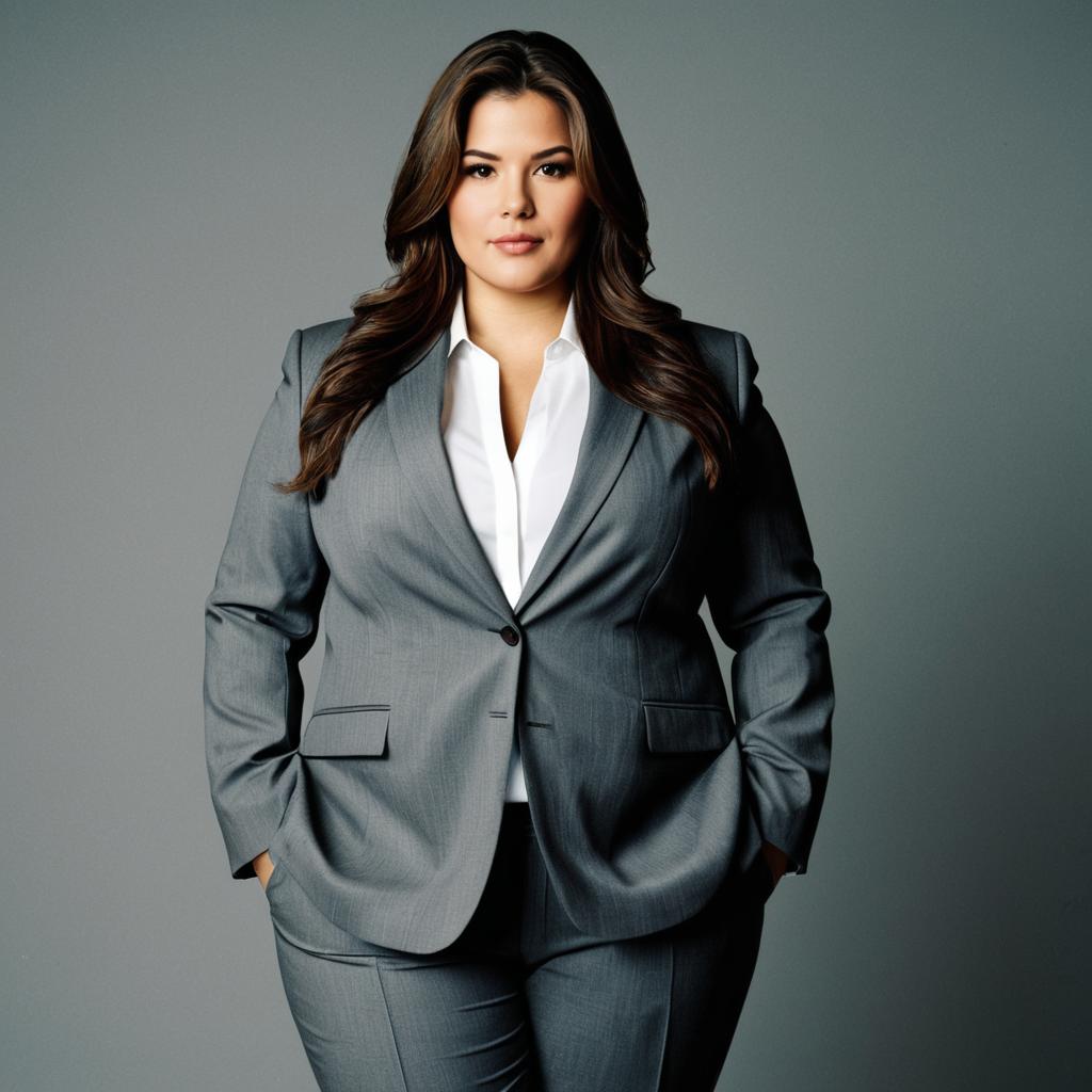 Close-up portrait of a plus size woman with short brown hair wearing a brown sequin evening dress. She accessorizes with sparkling diamond earrings and a matching necklace. The woman has a confident expression, looking directly at the viewer against a dark, glittery background.