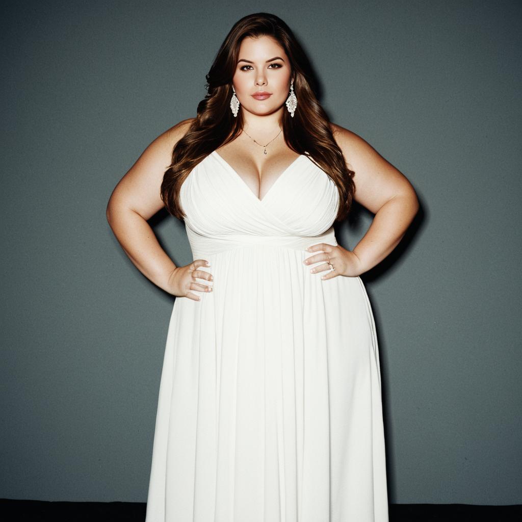 Plus size sequin evening ,1girl, solo, jewelry, realistic, dress, earrings, looking at viewer, necklace, breasts, brown hair, short hair, closed mouth, short sleeves, brown dress, arms at sides
