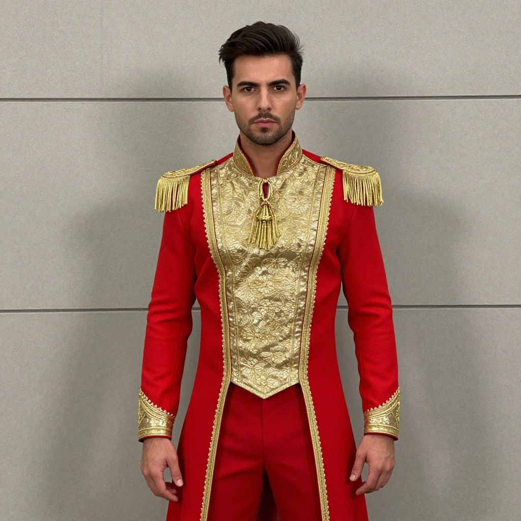 Photograph of a handsome man with short, dark hair and stubble, standing against a plain, light gray wall. He wears a vibrant red military-style jacket with gold embroidery and fringe epaulettes on the shoulders. The jacket has intricate gold patterns on the chest and cuffs, and a high collar with a small button at the center. He also wears matching red pants with gold trim. His expression is serious and focused, and his stance is straight and confident. The image has a slightly digital, CGI-like quality, emphasizing the bright colors and detailed textures of the clothing.