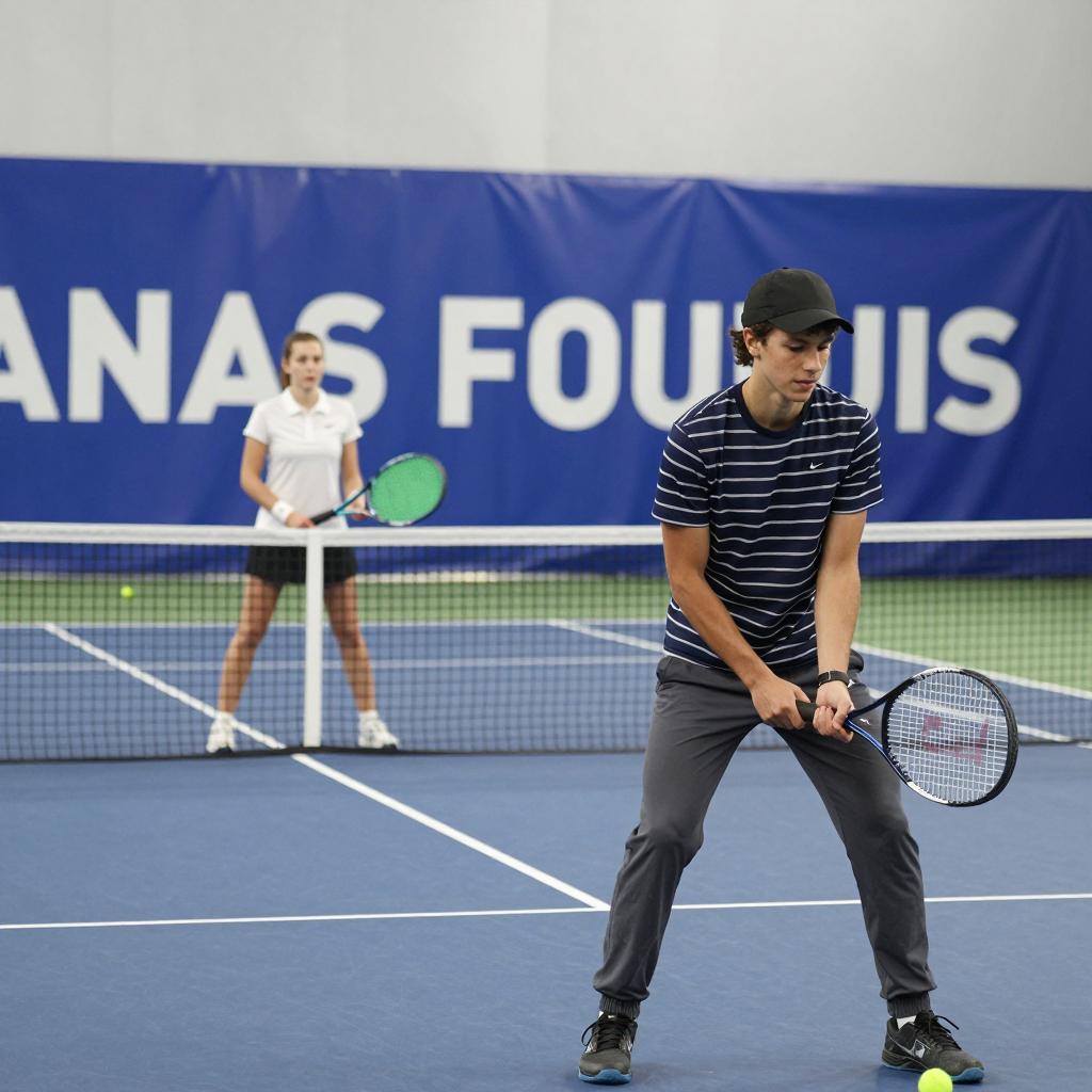 Two people playing tennis indoors. Foreground: young man with dark hair, striped shirt, black cap, and gray pants, holding tennis racket, looking down. Background: woman with brown hair, white shirt, black skirt, and white sneakers, holding tennis racket, standing. Blue banner with white "ANAS fournis" behind net. Tennis court with blue surface and white lines. Net in center. Yellow tennis ball on court near young man's feet.