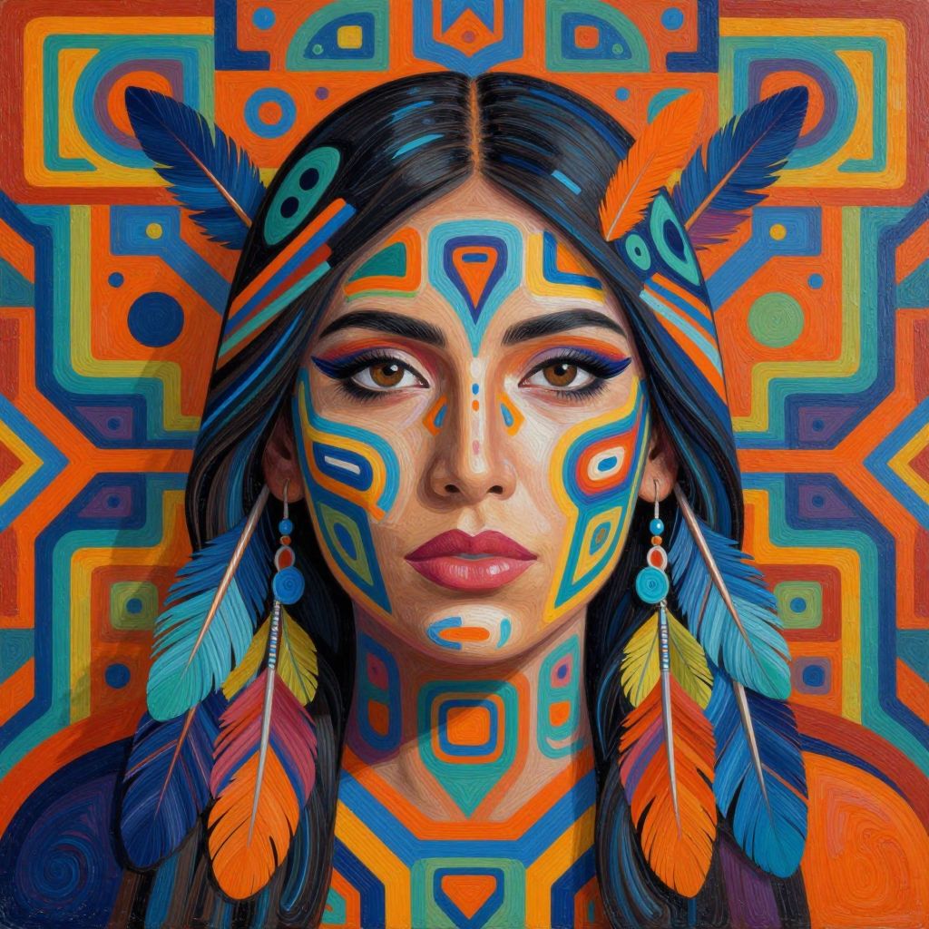 Digital artwork of a woman with long black hair, vibrant orange-blue geometric face paint, colorful feathers in her hair, and matching earrings, set against a