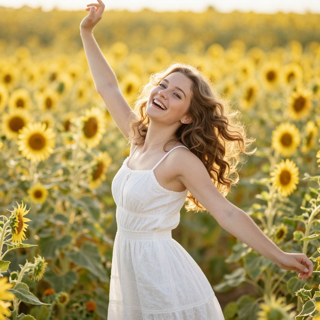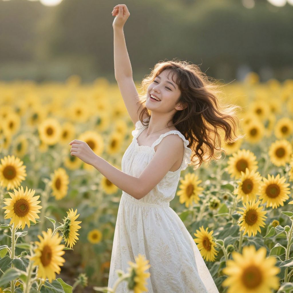 Photograph of a smiling, curly-haired woman in a white sundress, dancing joyfully in a sunlit sunflower field.
