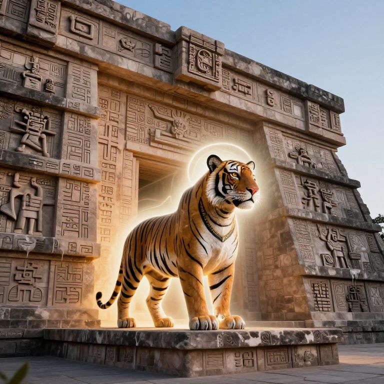 Photograph of a realistic, glowing tiger statue standing in front of an ancient, intricately carved stone temple with geometric and symbolic engravings under a
