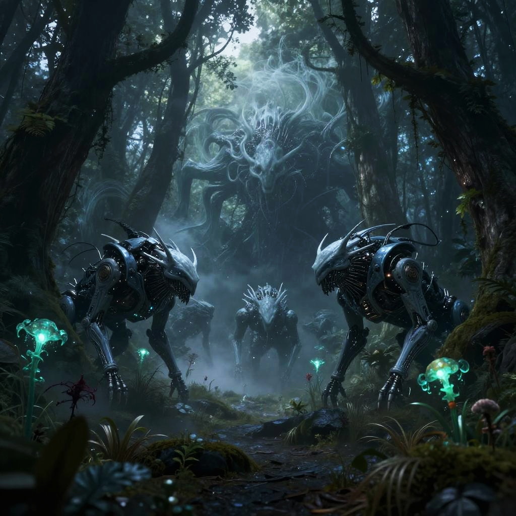 Visualize dark fantasy ai prompts portraying a mystical forest inhabited by phantom-like cyborg beasts, with bioluminescent flora and dark, swirling mist, all bathed in a cold, otherworldly glow, highlighting the fusion of the supernatural and futuristic technology.