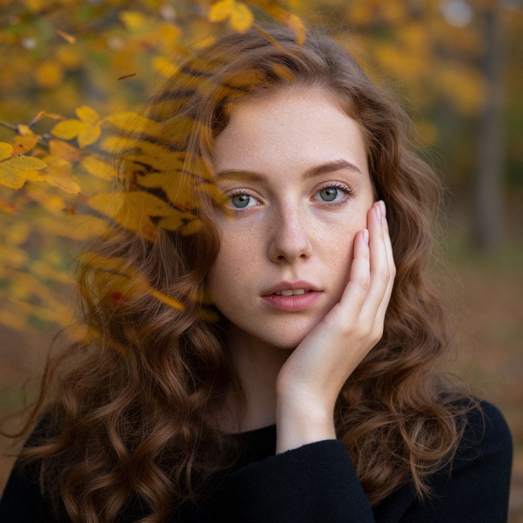A captivating portrait showcases a young woman with cascading chestnut waves framing her delicate freckled face. Her emerald eyes hold intrigue as she gazes off into the distance, one hand thoughtfully resting on her cheek. The double exposure effect is achieved through an ethereal overlay of vibrant autumn foliage—golden leaves swirling around her form, caught in an unseen breeze. This surreal merging creates a striking contrast between warm and cool hues, capturing both nature's fleeting beauty and human emotion's enigma.